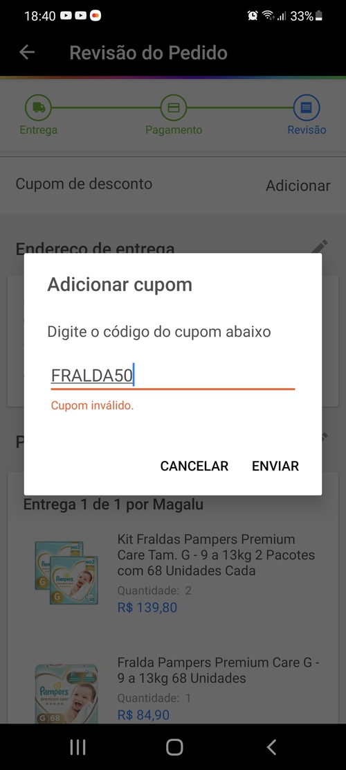 Fui no mercado pelo app da Magalu, coloquei mais de 200 em fraldas e mesmo assim não está aceitando o cupom. Detalhe em ambas as opções que escolhi são vendidas pela Magalu.
