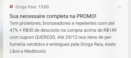 Recebi a notificação do app da Droga Raia que concede R$30 reais de desconto nas compras acima de R$149,00 em protetores, etc. Tentei com anti-idade e com o Isdin e deu certo. Cupom não é válido para medicamento. Não sei se é para todos ou só para selecionados.