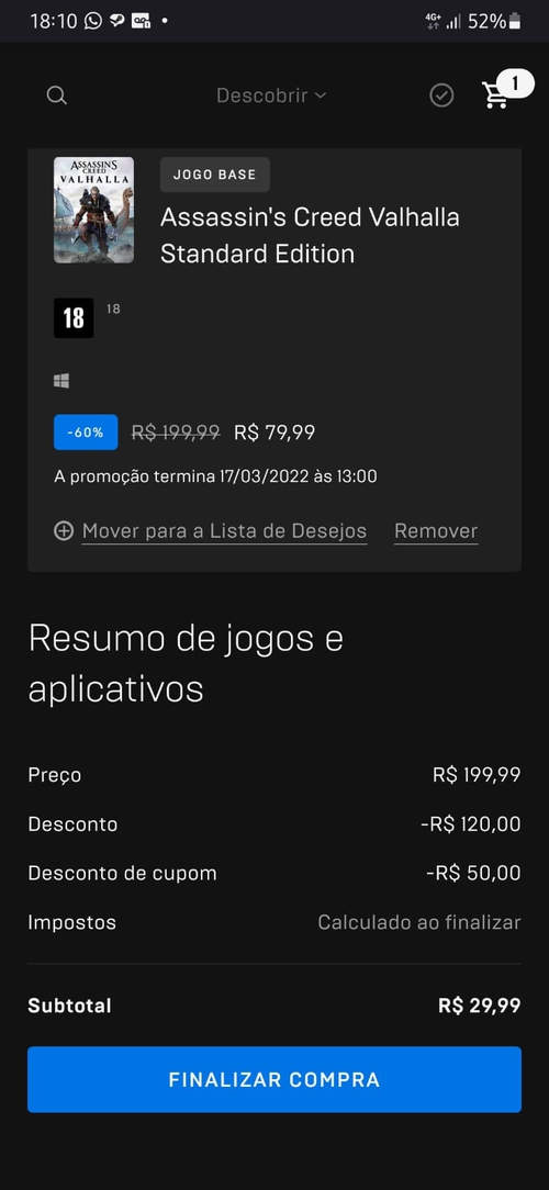 Só usar o cupom R$ 50 da epic para chegar ao valor de R$ 29,90