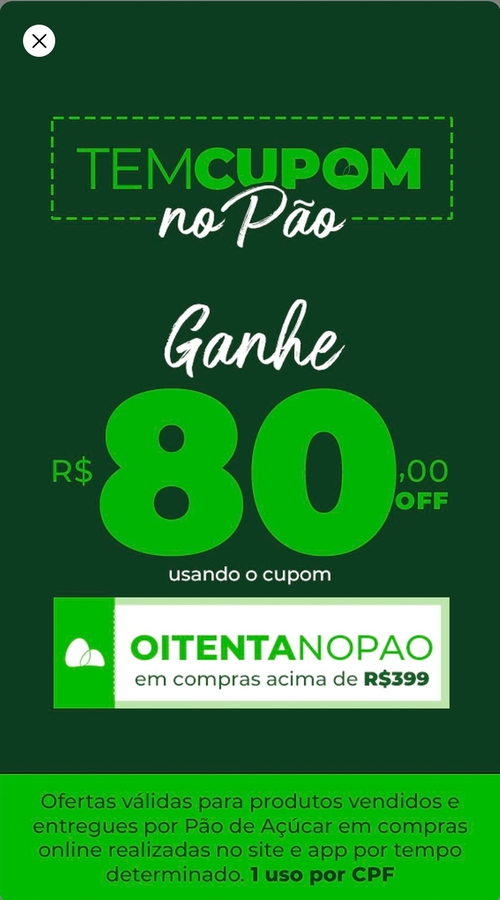 Cupom garante R$80 de desconto em compras acima de R$399 no Pão de Açúcar