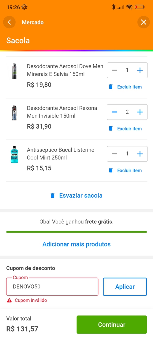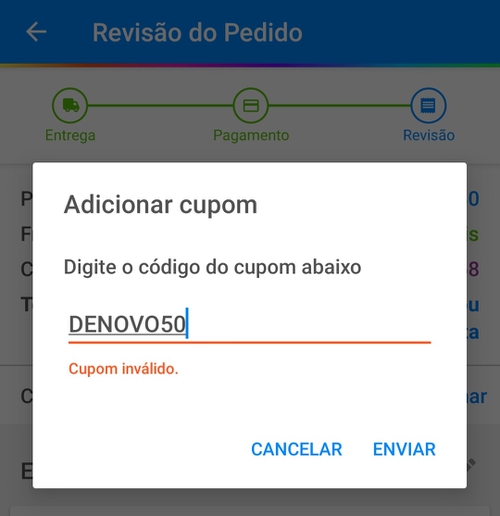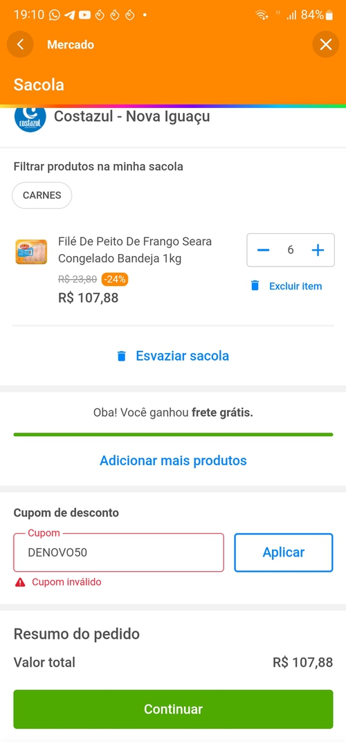 Recebi o cupom no whatsapp 12:35, funcionou de boa, 1,5kg de picanha e 1kg de coração, saiu 56 reais
