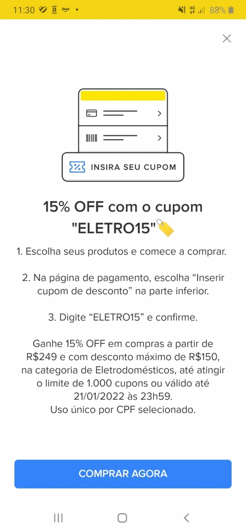 Um cupom válido por CPF, para compras de Eletrosdomésticos a partir de 249,00