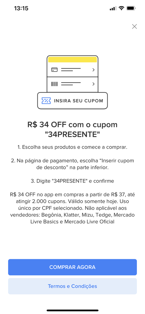 Cupom Mercado Livre de R$34 OFF acima de R$37 para selecionados