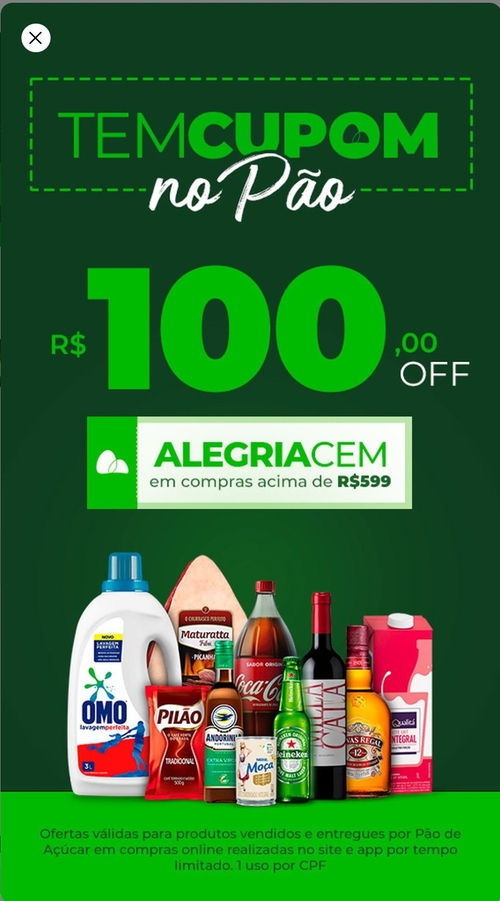 Cupom pão de açúcar R$100 de desconto em compras acima de R$599