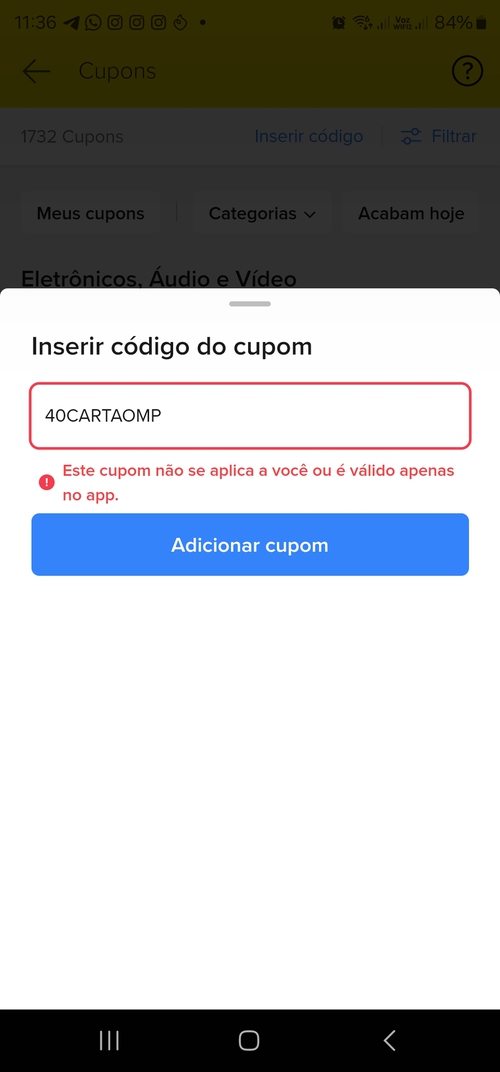 Esse cupom não se aplica a vc, aconselho tbm que verifiquem no App M Pago no ícone cupons pois muitas vezes há cupons disponíveis que não são anunciados e nessa só hj consegui 32 conto de desconto 🤑