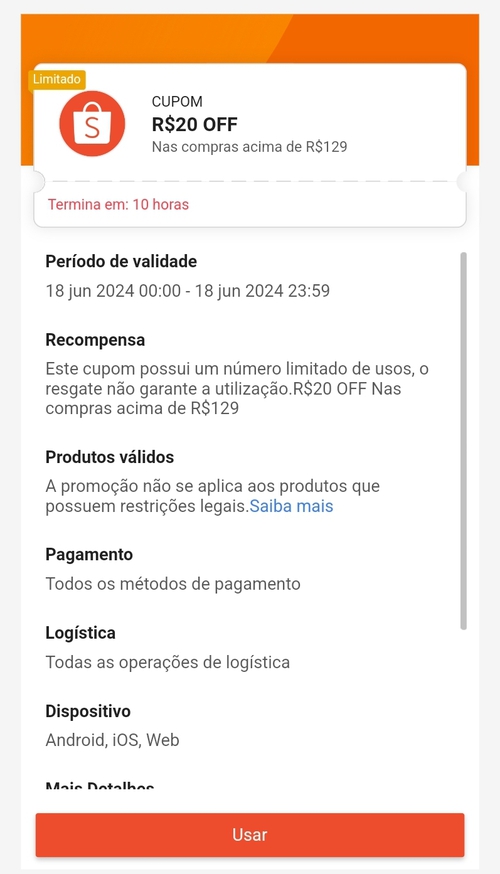 CUPOM R$20 OFF Nas compras acima de R$129