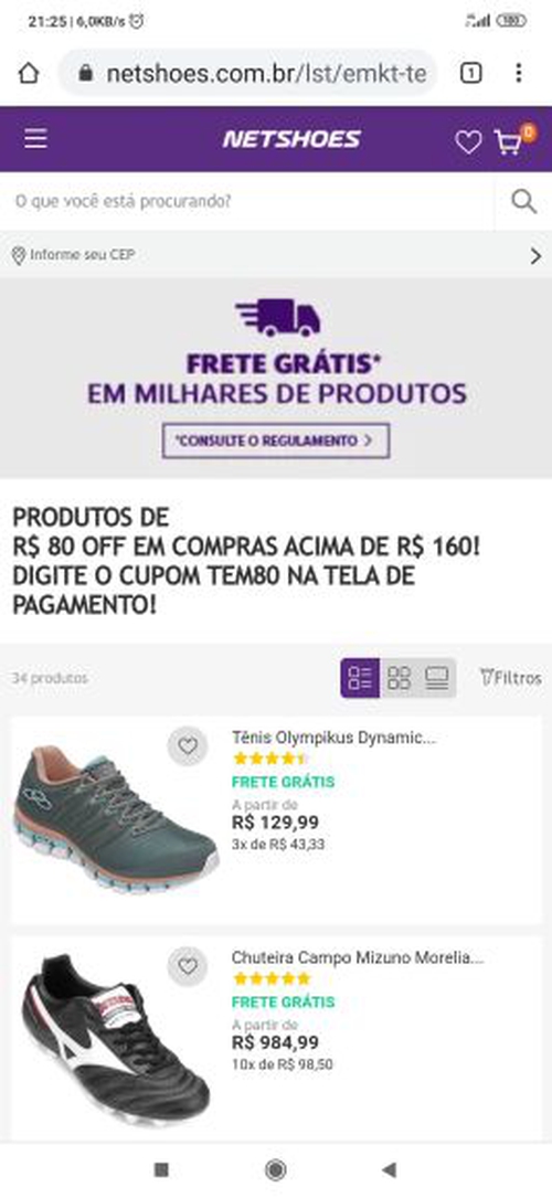 Cupom R$ 80 OFF na Netshoes - Mínimo de R$ 160