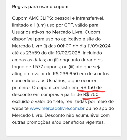 Cupom R$150 off em R$750 compartilhando vídeos no Mercado livre