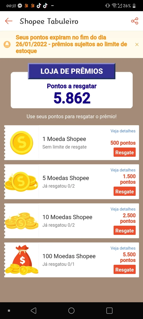 Tô numa raiva eu juntei os 5.500 ontem de madrugada, peguei e resgatei as 100 moedas (da outra vez muita gente deixou pra pegar de última hora e as 100 moedas esgotou)Sacanagem da shopee informar essas promoções depois, pq provavelmente não terei pontos suficiente pra pegar esse cupom.