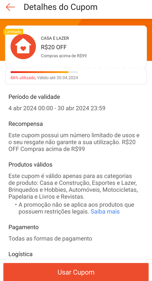 Cupom Shopee oferece R$20 OFF para compras acima de R$99