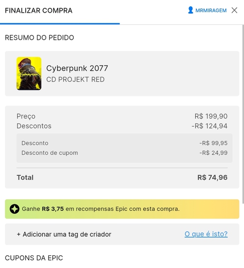 O jogo está com 50% de desconto. O valor é somente aplicado ao final da compra com o cupom de 25% que todos receberam (Segundo a Epic).