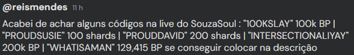 Acabei de achar alguns códigos na live do SouzaSoul : "100KSLAY" 100k BP | "PROUDSUSIE" 100 shards | "PROUDDAVID" 200 shards | "INTERSECTIONALIYAY" 200k BP | "WHATISAMAN" 129,415 BP se conseguir colocar na descrição