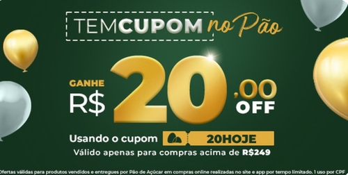 Nas compras acima de R$ 299,00 (duzentos e noventa e nove reais), utilize o cupom [ 20HOJE ] e garanta desconto de R$ 20,00 (vinte reais), seja no site ou app do Pão de Açúcar.