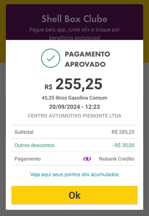 Amigos, vi alguns amigos com dificuldade e sem ter conseguido o desconto ...precisa ter conta no Nubank crédito ou débito, tanto faz, mas precisa escolher certo na hora de abastecer senão não vai autorizar o pagamento....eu só tenho crédito. Entrei no Shell Box ativei o Nupay, me direcionei pro app do Nubank e autorizei o uso do Nupay para o Shell Box...... Na hora de abastecer escolher a forma de pgto Nubank crédito....foi abastecido...e só antes de finalizar o pagamento (pulo do gato), apareceu o desconto dos stixs , recusei esse desconto clicando no "x" nessa opção, nesse momento apareceu outras opções para desconto dos cupons q tinha cadastrado, escolhi o cupom dos 0,60 (que estava dando pra mim 24,79 de desconto), aí finalizei o pagto (que foi no Nubank crédito)...aí deu show autorizou o pagto eu paguei 24,79 a menos no abastecimento....DETALHE meus stixs q eu tinham, sumiram mas foi coincidência pois eles tem validade de um ano e sempre expiram em setembro..... quanto ao NUPAY tirei todas as dúvidas ligando no 0800 do NUBANK .... SHOW DE DESCONTO,o maior desconto que consegui desde q o primeiro abastecimento pelo Shell Box ... parabéns a quem postou.. ..