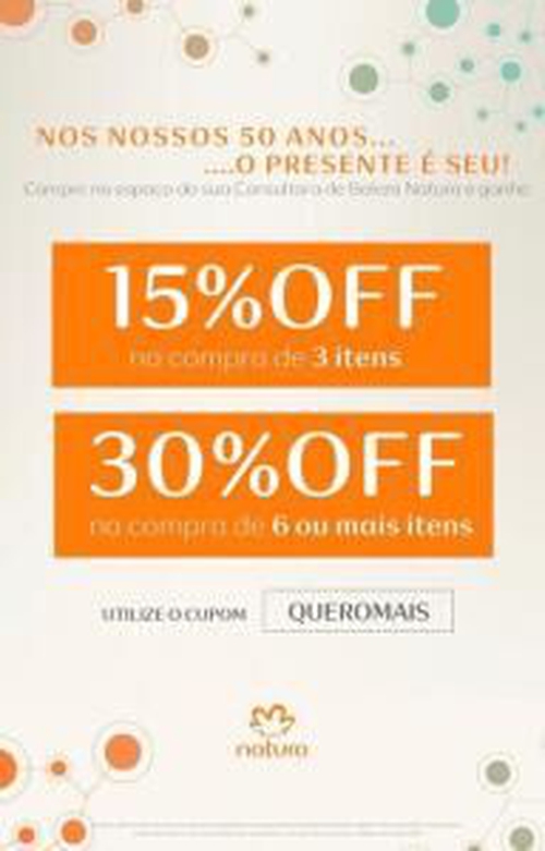 Atenção: Cupom válido somente para as compras realizadas nos espaços de Consultores Natura Digitais. Não aplicável em presentes, sabonetes e itens com selo Outlet. Válido 22/08/2019.