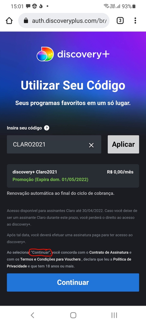 Neste link, fala que mesmo se fizer agora, é grátis: claro.com.br/discovery-plus#ativar-c...astro
