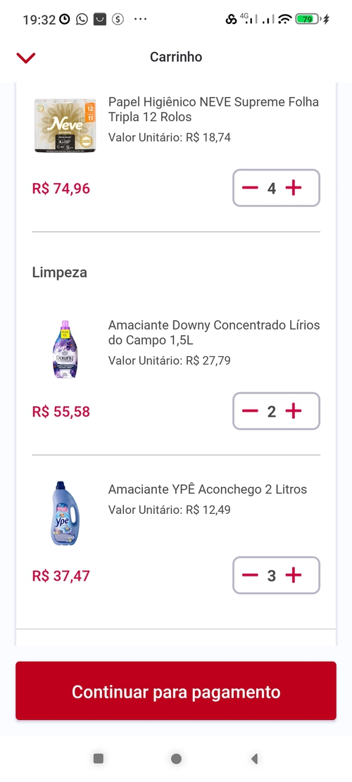 Consegui comprar 4 pacotes, mas têm diversos itens de limpeza e higiene com até 70% de desconto real como ex detergente limpol por 81 centavo; 4 esponjas qualita por 1,41; 2 escovas ORAL B 3D por 7,44