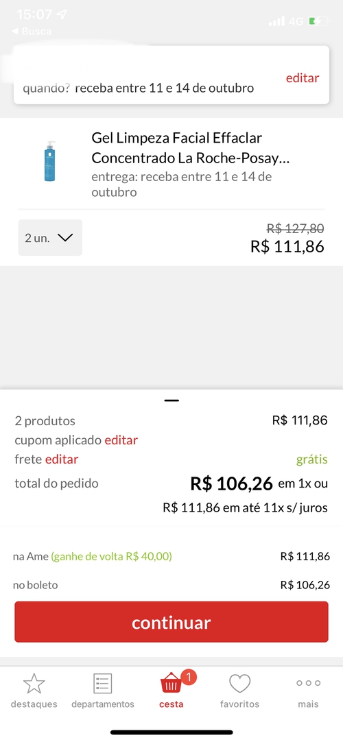 Aqui não deu esse cashback de 40$ não. Só 1% (2$)