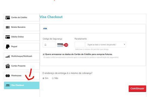2. Vá até a última etapa de compra e escolha a opção pagar com visa-checkout (é a última opção do canto esquerdo, lá embaixo).