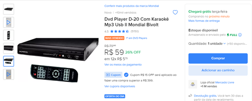 Dvd Player D-20 Com Karaokê Mp3 Usb Il Mondial Bivolt
