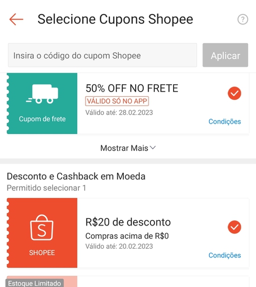 Adicione o cupom de desconto no carrinho pra obter o desconto, selecione os 20 reais