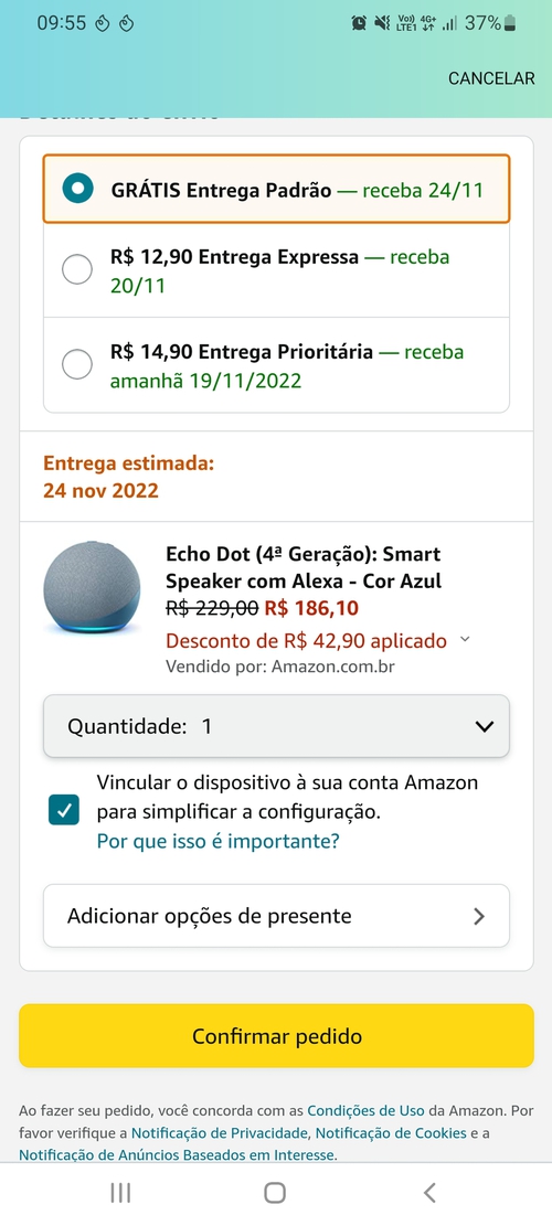 E nem preciso, quase pegando essa e deixando minha 3 na salaPreço tá maravilhoso, é o mais baixo que eu já vi, pode pegar sem medo. Para quem quer saber qual a diferença/vantagem comparado a echo dot 3, essa tem um sensor de movimento, que você pode usar para programar rotinas, além de ter um som superior. Agora em relação à qual escuta melhor q a outra, isto é um mito, ambas possuem a mesma capacidade