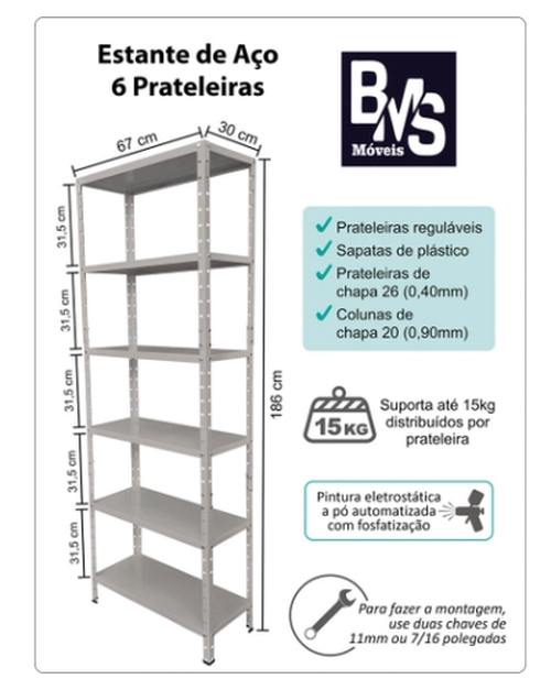Espessura: Prateleira de chapa 26 (0,40mm) e coluna de chapa 20 (0,90mm)