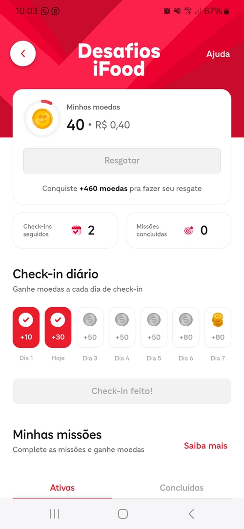 Ontem navegando pelo app do ifood vi que tem uma função nova: fazer check-in diariamente e ganha moedas. Depois de uma certa quantidade, você pode resgatar e usar como saldo.