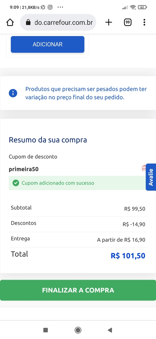 Aqui funcionou adicionando 12 itens, ou seja, acima de R$ 200,00. Site meio bugado, mas, no final, deu certo.