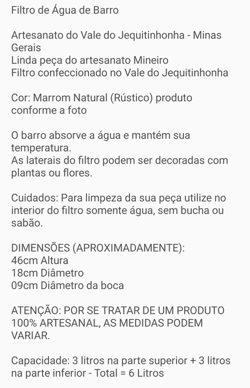 Tenho um filtro de barro de Jequitinhonha, Minas Gerais, diferentemente da água de garrafão de 20 litros, esse além filtrar deixa a água fria, na temperatura ideal para beber, pelo menos para mim.