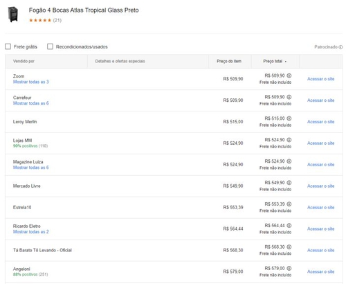 Fogão 4 Bocas Tropical Glass Atlas Preto | R$510