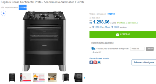 [MAGAZINE] Fogão 5 Bocas Continental Prata - Acendimento Automático FC5VS