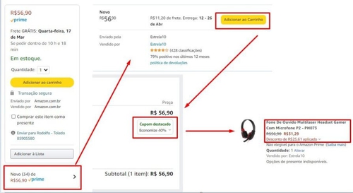 Necessário selecionar lojista Estrela10 e adicionar cupom conforme instruções na imagem