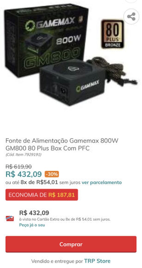 Fonte de Alimentação Gamemax 800W GM800 80 Plus Box Com PFC - R$432
