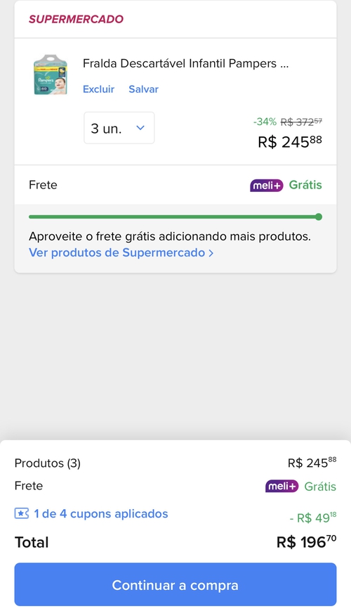 Adicione 3 pacotes e ative o cupom 20% off mercado.