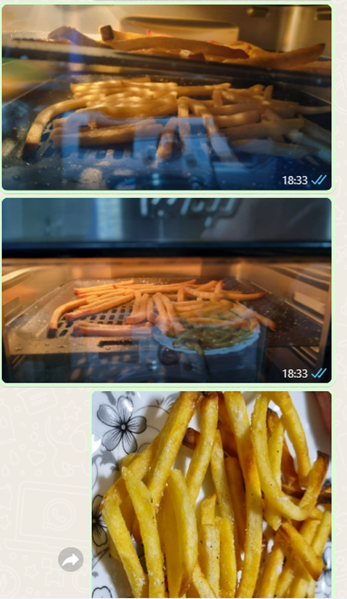 Primeiras fritas de teste... 200g... coloquei nas bandejas... o tempo da função fritas para a bandeja de cima é muito, tirei na metade e um pouco queimada, mas crocante.... talvez era pra ter colocado no cesto, as de baixo mais 5 minutos...