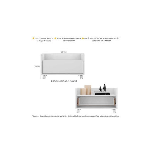 ⭐️ 4.5 (267 avaliações)Gabinete Armário Banheiro 60 cm com Rodízios Multimóveis é uma solução prática para você aproveitar aquele espaço restrito e complementar seu ambiente. Produzido em MDP com acabamento acetinado (cerca de 20% de brilho), que garante maior durabilidade e facilidade na limpeza, possui 1 gaveta com amplo espaço interno e corrediças metálicas que proporcionam mais leveza no manuseio. Os rodízios facilitam a movimentação do móvel na hora da limpeza. Seu design clean permite que ele seja utilizado em diferentes ambientes, adaptando-se conforme sua necessidade.Conteúdo da Embalagem:Dimensões do produto montado: