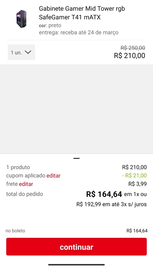 Peguei um! Aqui pra mim saiu por 160,00. Primeiro busquei o gabinete no Google, depois quando abriu o link no APP da Americanas eu apliquei o desconto e foi.
