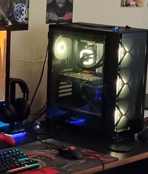meu gabinete... muito bom... só tive dois problemas com ele: não consegui ligar as fans pela controladora que veio nele. Tive que ligar todas direto na placa mãe, mas os cabos de rgb funcionaram na controladora e ficaram sincronizados. E o outro é que tem uma furação pra passar fio que a fonte tapa, aí não dá pra passar os cabos que conectam na parte inferior esquerda da placa mãe por lá.