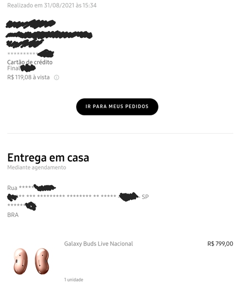Pedimos desculpas por este ocorrido, informamos que iremos cancelar a compra e realizar o reembolso do valor pago. Porém manteremos válido o voucher de R$300,00 reais, para que você possa adquirir o Galaxy Buds Live na nossa Loja Online (voucher: ESPECIAL300 - válido até 08/08/2021).