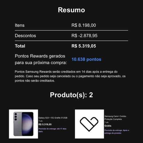 E como fiz cadastro na Samsung em janeiro para pré venda, ainda vou ganhar o carregador sem fio + Os outros brindes que vocês já sabem.No chat também me passaram hoje o valor de 4535 no Pix. Mas aí eu pensei 2x e fiquei com meu dinheiro. Kkk