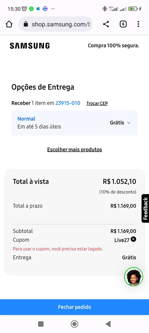 Ta bugado. Você faz login no site da Samsung e quando vai colocar o cupom daxa mensagem que precosa estar logado.. Esse site da Samsung é um nojo 🤮