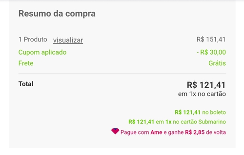 Preço a vista usando o cupom pelando10, ainda recebe 3,10 de cashback caso pague pelo AME