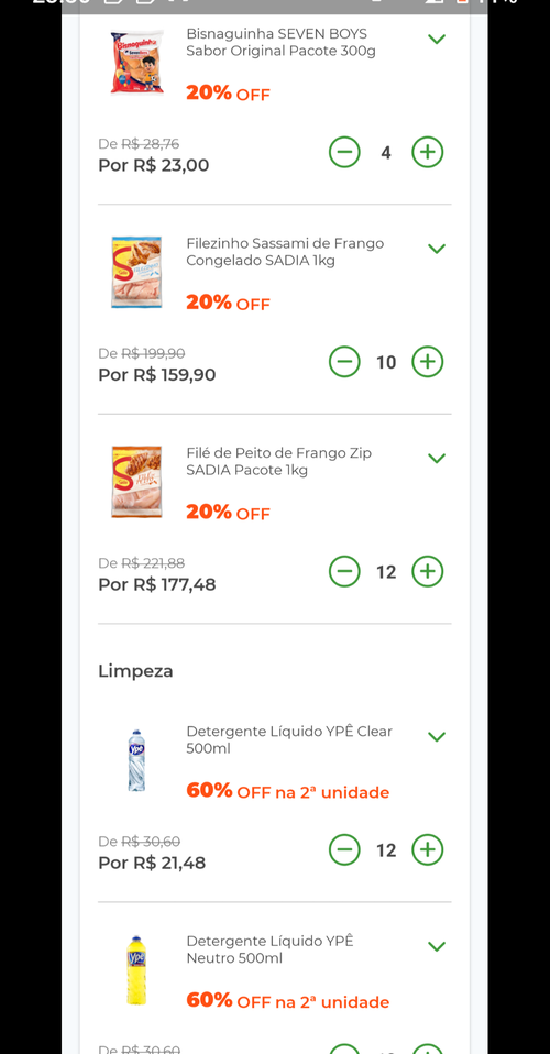 Bisnaguinha: R$4,60Filezinho sassami: R$12,80Filé de frango R$11,85Detergente ype: R$1,43Obs: coloquei pra entrega. Talvez a opção de retire na loja pode não ter alguns produtos.Muito obrigado. Até agora não tenho o que reclamar do PdA, todas as vezes que comprei lá nunca faltou nenhum item, ao contrário da Americanas. Até para retirar é rápido, é bem organizado Preços são realmente mais altos que a média, mas com cupom compensa.