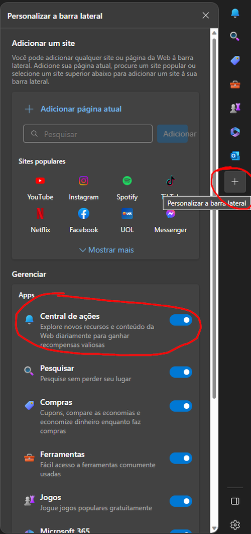 Ativar a Central de Ações no Edge ou no Edge Dev? (Nao encontro aqui)