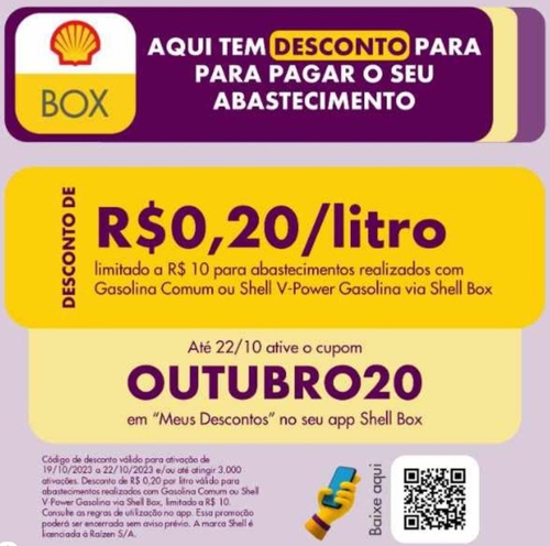 Ganhe R$0,20 centavos por litro até R$10 OFF com cupom Shell Box