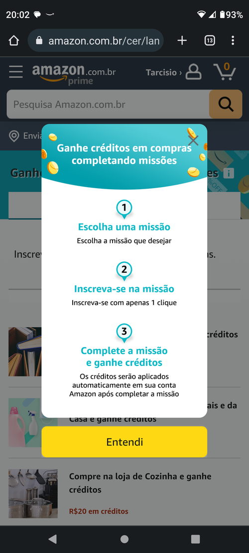 - Caso um cliente inscreva-se e conclua uma missão dentro do Prazo de conclusão da missão, o cliente será recompensado com créditos de R$20 desconto para a sua próxima compra de produtos elegíveis na Amazon.com.br.