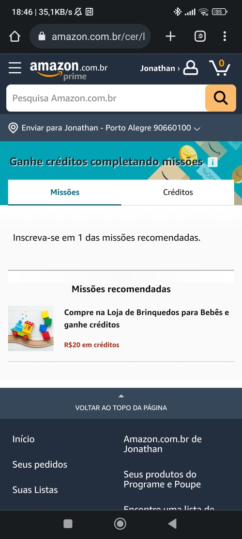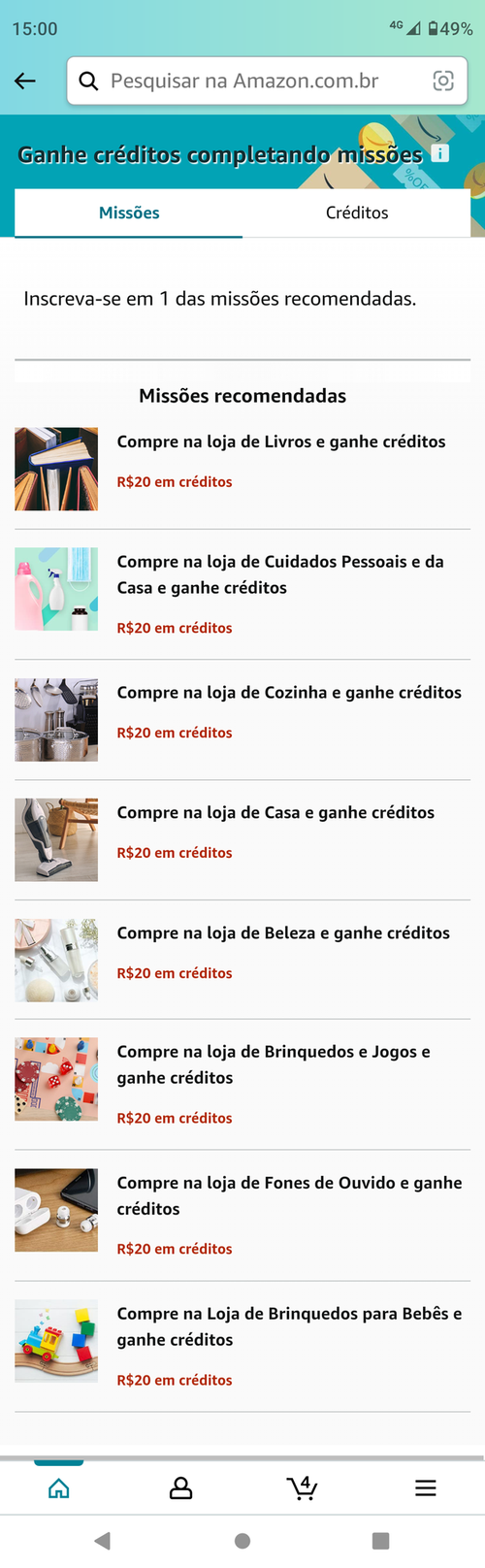 - As missões são individuais e intransferíveis, baseadas em compras na Amazon.com.br. Por exemplo: "Compre na loja de Brinquedos e Jogos e ganhe R$20 em créditos". A compra para realizar a missão não terá quaisquer benefícios de descontos vinculados a esta Promoção. Fica o cliente ciente de que os créditos a serem disponibilizados depois que a missão estiver concluída serão aplicáveis a compras futuras.