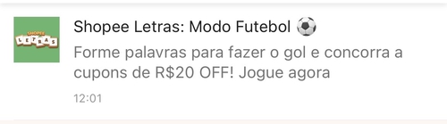 Novo jogo na shopee de futebol, formar letras, no final tem um presente, nesse presente há o cupom 20 off, conseguir no segundo presente.