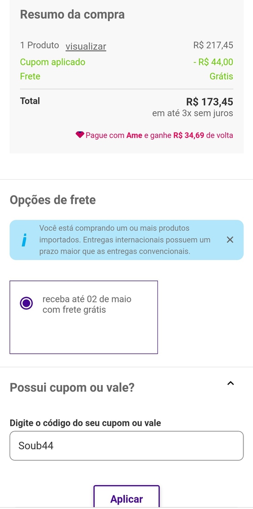 Pague via AME e tenha Cashback de 50%, ou seja, R$86,73.
